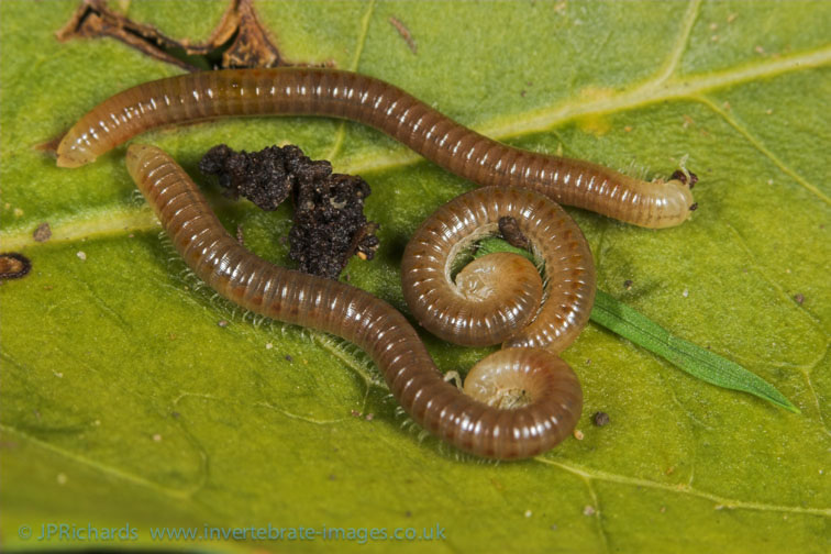 This pallid species, with orange ozadenes, is readily identified among the British and Irish Julidae (except the very rare Metaiulus pratensis) in completely lacking ommatidia (eyes). However, on occasions it has been confused with Blaniulidae, such as Blaniulus guttulatus, which are considerably more slender and lack dorsal body striae.