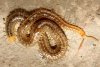 Henia vesuviana is a large robust species (to 50 mm long) of distinctive shape with relatively small head and tail end and with a large number (63-75) of leg pairs. It is often found curled into a defensive ball when encountered. Specimens often appear grey in life due to the purplish mottling on the brownish-orange body, with a thin white line running the entire length of the body and contrasting orange head and tail (also seen in Geophilus carpophagus s.str., which has fewer leg pairs).