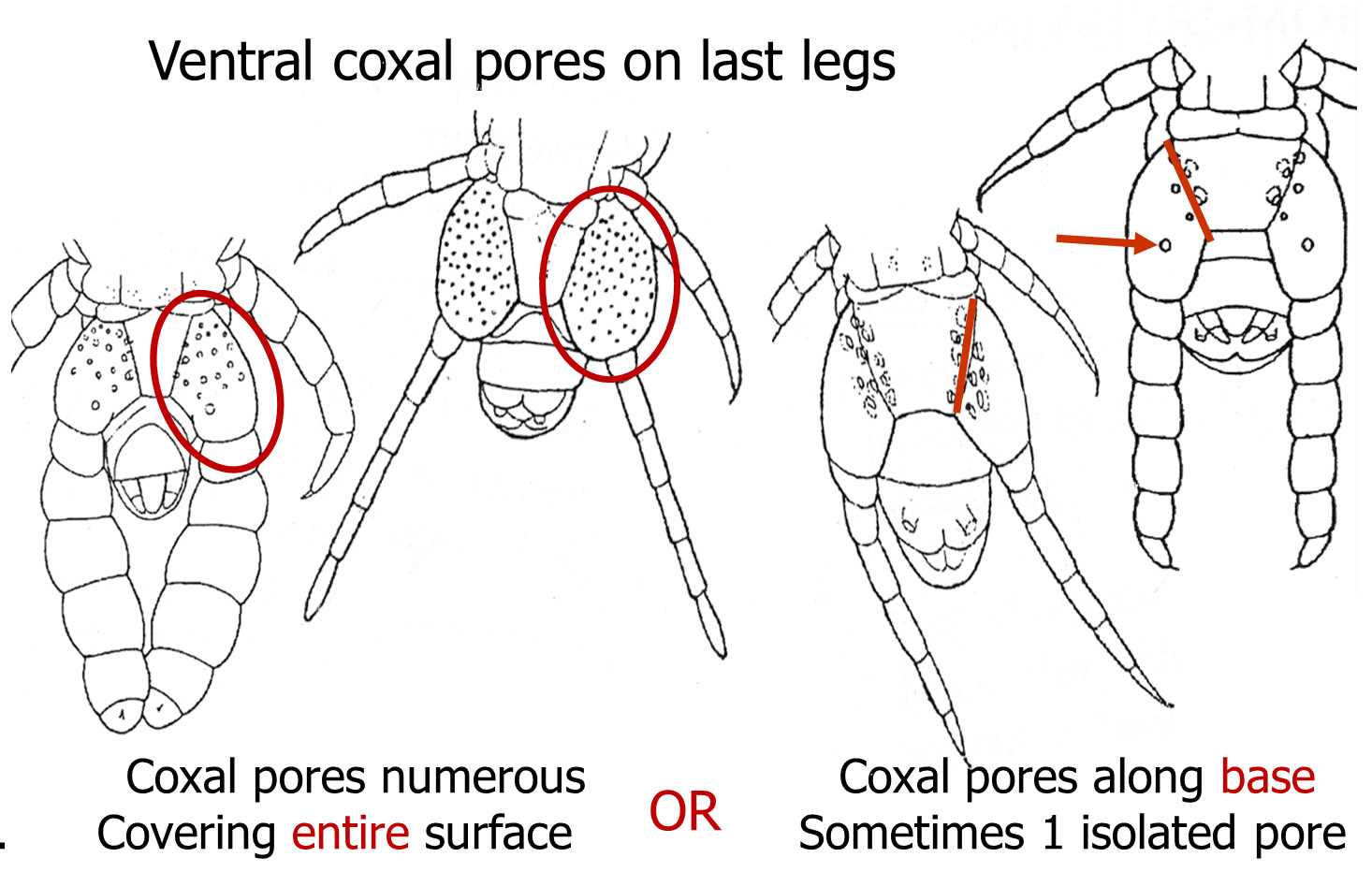 Coxal pores are found on the coxae at the base of the last pair of legs. In most species these are located on the ventral surface, but also additional pores on the anterior surface of a few species.