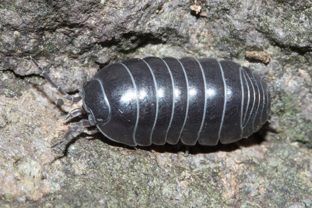 Armadillidium vulgare is the common large pill-woodlouse (to 18 mm body length). Although often uniform slate grey, it can be highly variable in colour and mottled forms are often seen. However, it lacks the diagnostic contrasting dark patch on the 7th epimera, and the well developed ornate mottling, characteristic of the uncommon A. pulchellum or A. pictum. See Gregory & Richards (2008) for details of the identification of these three species.