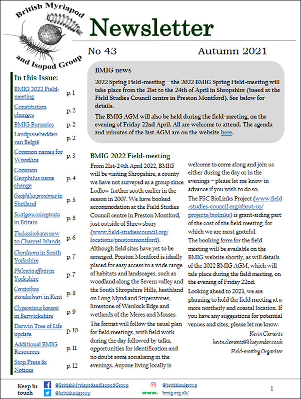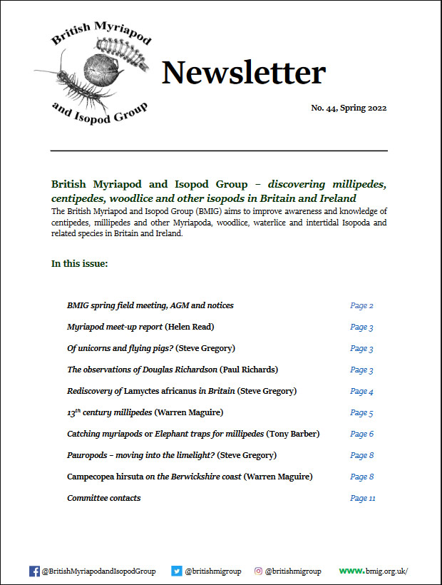 Earlier (pre-BMIG) Newsletters are also available: British Myriapod Group Newsletter and British Isopod Study Group Newsletter.